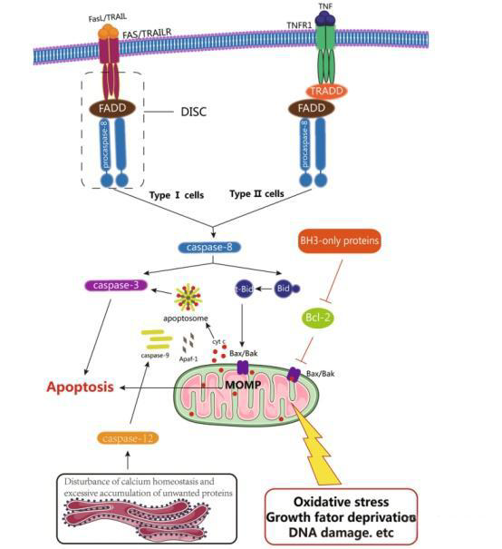 细胞凋亡的信号通路主要包括外部信号通路和内部信号通路。外部信号通路是指来自细胞外环境的信号,例如细胞因子、生长因子或细胞外基质的变化等。这些信号通过细胞膜上的受体与细胞内信号传导分子相互作用,最终触发细胞凋亡。内部信号通路是指细胞内部的信号通路,包括DNA损伤、细胞内钙离子浓度改变、线粒体功能异常等。这些内部信号通过激活一系列的信号分子,如激酶、酶和转录因子等,最终引发细胞凋亡。